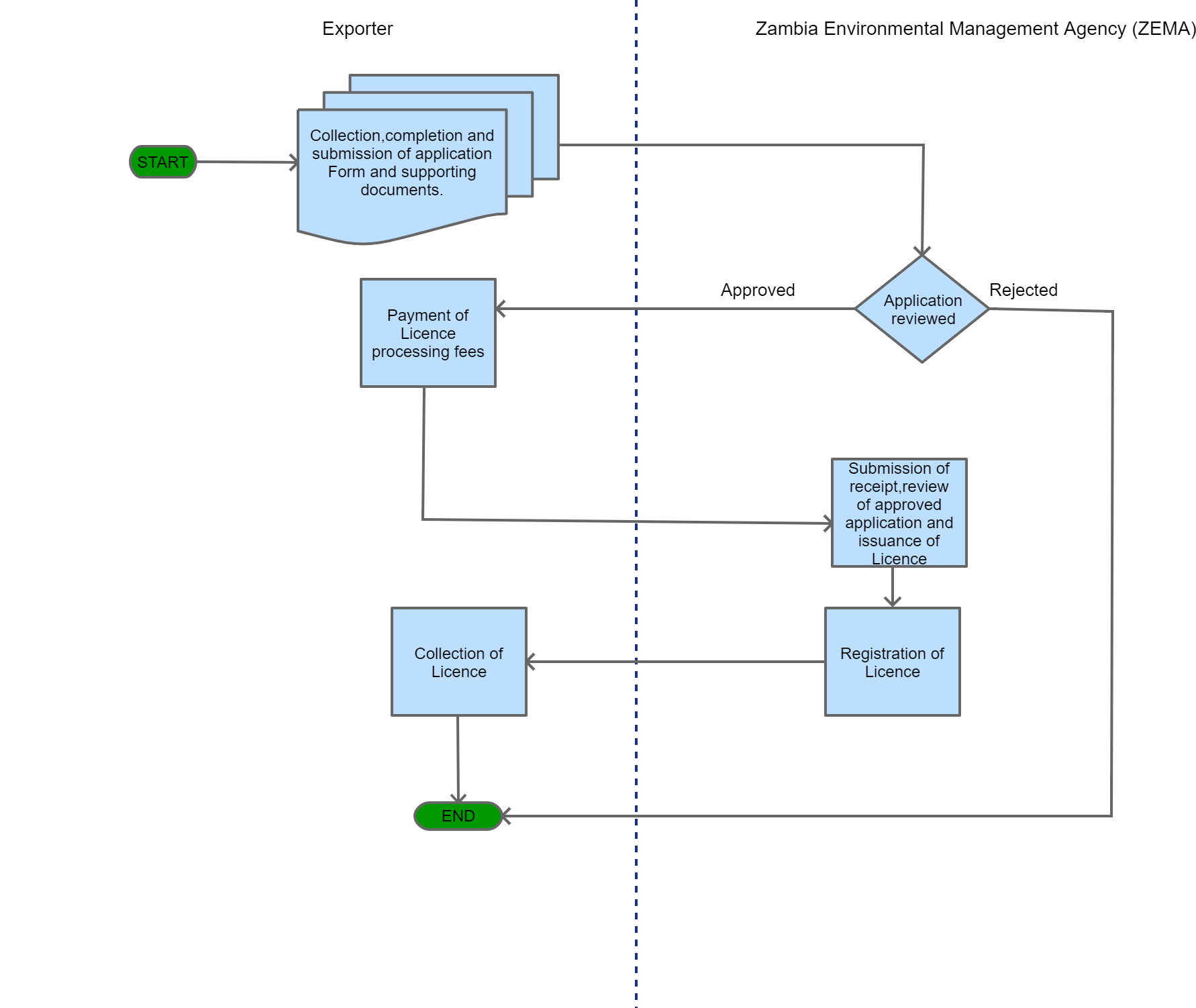 The Trader/exporter collects, completes and submits an application form with the supporting documentation to the Receiving Officer.